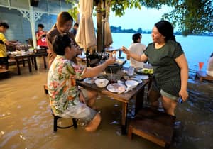 "This is a great atmosphere. During this flood crisis this has [become] the restaurant's signature attraction," 24-year-old Siripoj Wai-inta said as he ate his food with water up to his shins.